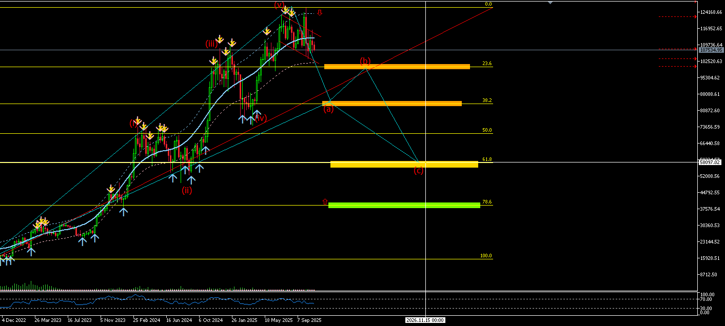 Coraz więcej traderów potwierdza, że zakończyliśmy trzyletni cykl wzrostowy i czeka nas standardowo, roczna bessa. Historycznie korekty na Bitcoinie zwykle sięgały -61,8% oraz -78,6% całej hossy — czyli najpopularniejszych poziomów Fibonacciego. Cały cykl wzrostowy od 2023 r. przypomina klasyczną Teorię Fal Elliotta, gdzie mieliśmy pięć fal wzrostowych, a teraz czekają nas trzy korekcyjne. Pierwszym poziomem do zaliczenia jako pewniak są okolice 100 tys. USD, ponieważ mamy tam górne Fibo -23,6%, a jako że jest to dość mocny, okrągły poziom, chwilę tam pozostaniemy z lekkim odbiciem. Kolejny target korekty to -38,2% z wyceną 85 tys. USD – jest to pierwsza duża fala korekcyjna A, potem klasyczne odbicie B i pogłębienie korekty do 60 tys. USD jako Fibo -61,8%. Niżej się nie spodziewam, ponieważ zbyt dużo funduszy czeka na tak niskie poziomy, a ciągle mamy wysyp pro wzrostowych newsów, co pokazuje, że czteroletnia cykliczność Bitcoina wciąż jest ważniejsza niż wydarzenia makroekonomiczne czy geopolityczne. Poniżej rysunek najbardziej optymalny, neutralny scenariusz.